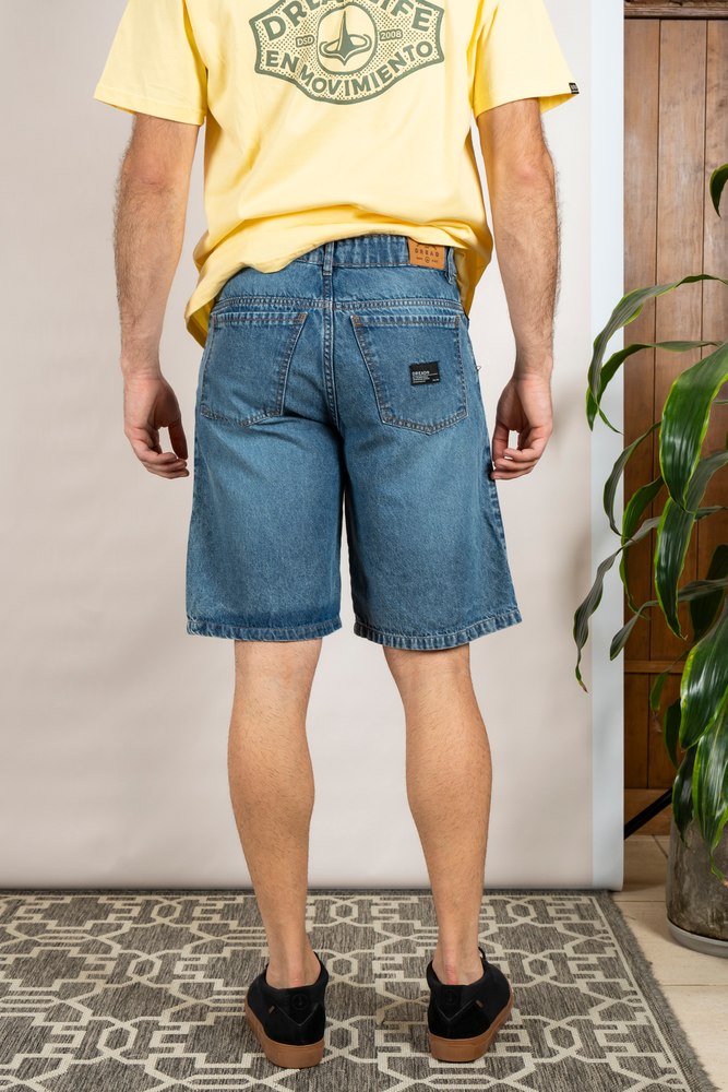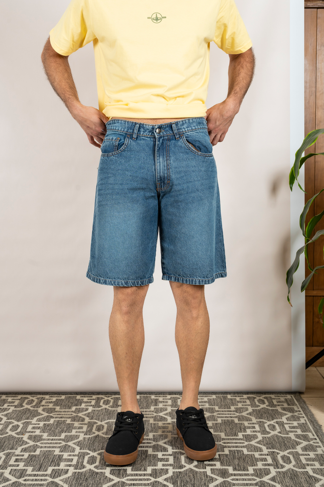 Bermuda jean 8oz. Corte clasico ancho.Cierre YKK. Badanas eco cuero. Lavado Stone.