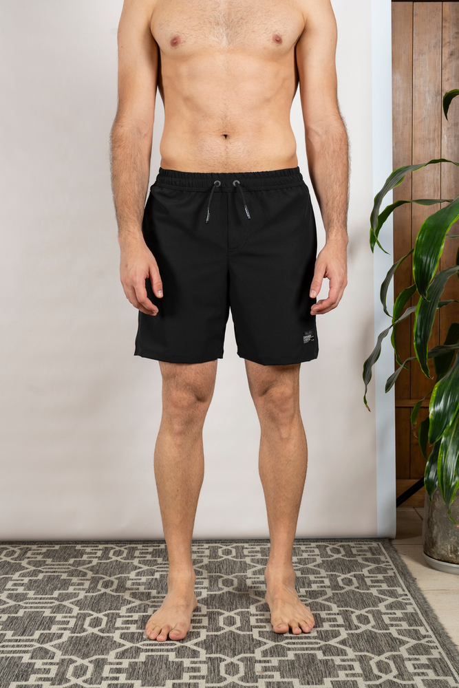 Short de baño liso microfibra elastizada, suspensor a tono. Secado rapido. Ojal y punteras Black Nikel personalizados, cordón negro tubo. Largo 17”