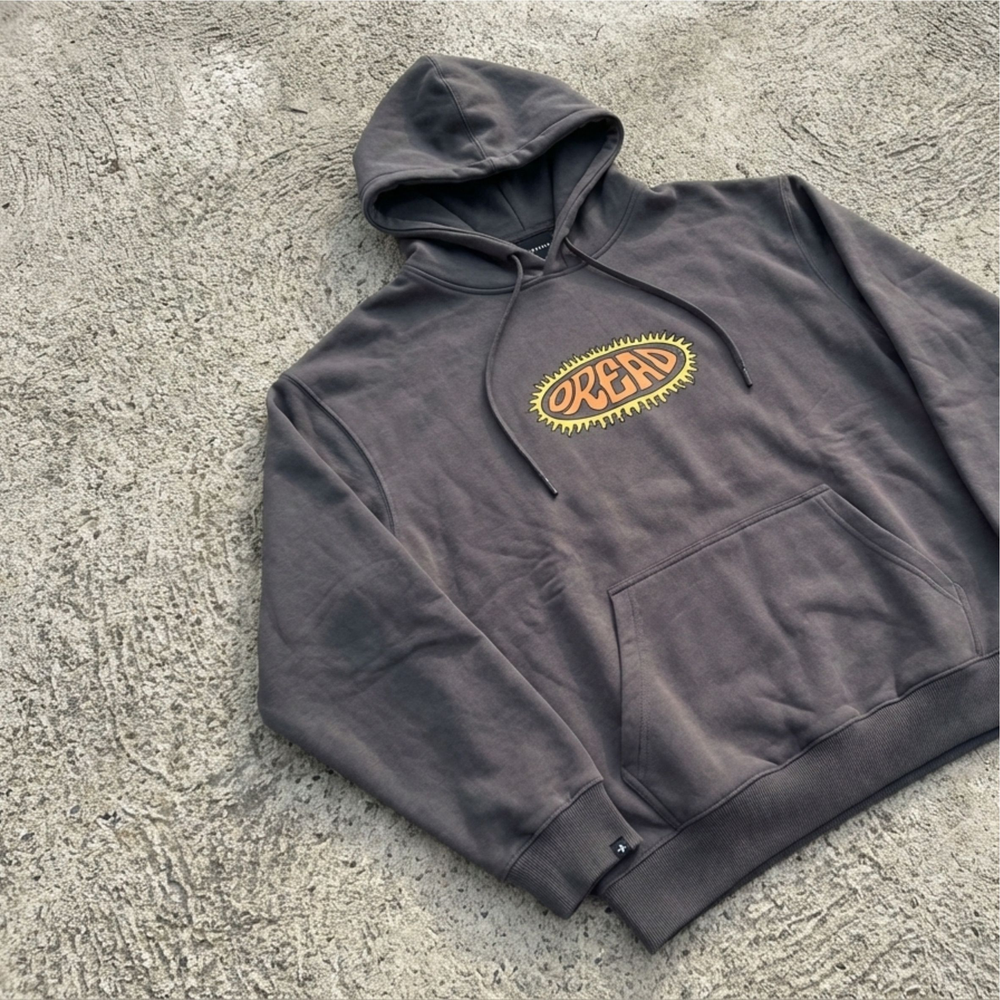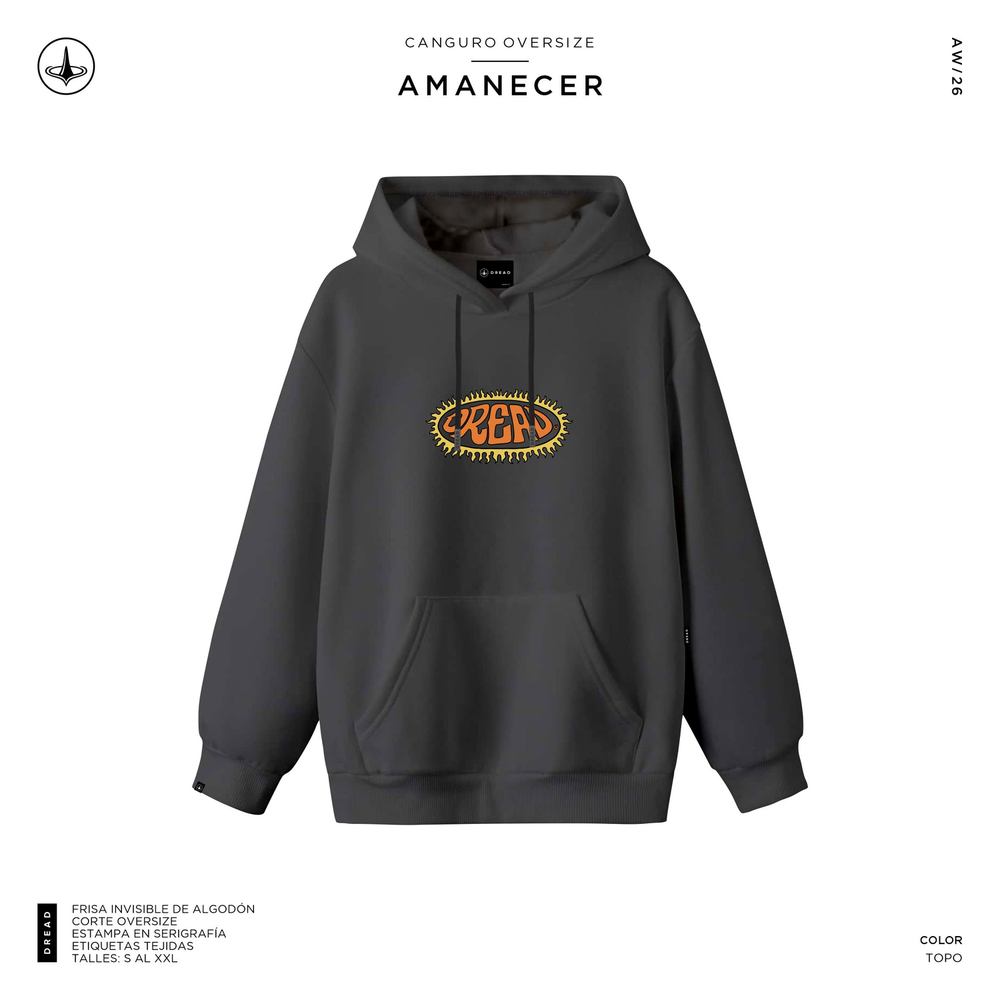 Canguro frisa pesado OVERSIZE, 100% algodon, estampado en pecho y espalda. Puño, cintura y capucha pisado doble aguja collareta. Detalle de punteras y ojales personalizados Black Nikel.
