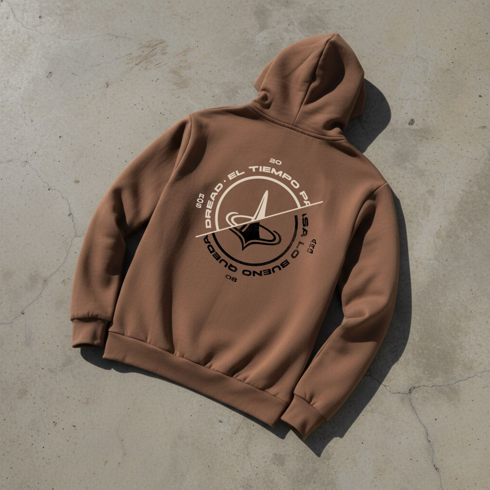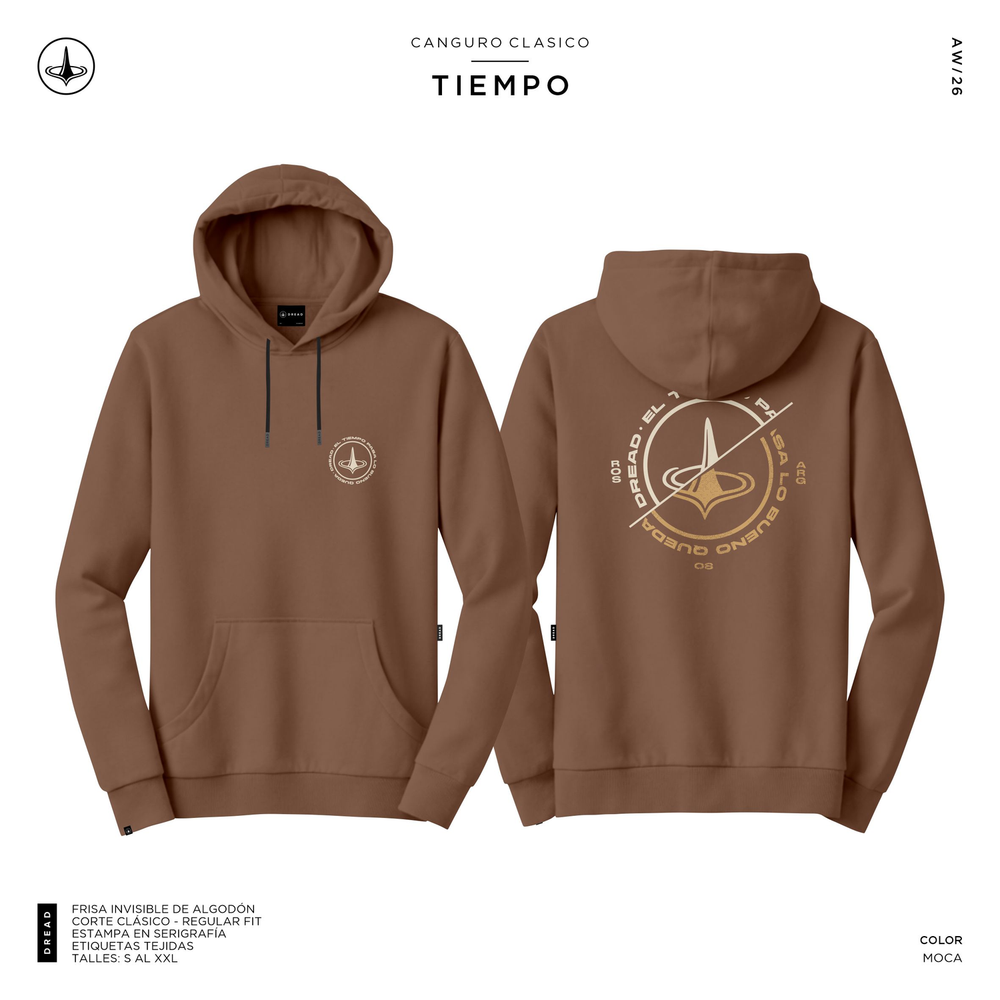 Canguro frisa pesado 100% algodon, estampado en pecho y espalda. Puño, cintura y capucha pisado doble aguja collareta. Detalle de punteras y ojales personalizados Black Nikel.