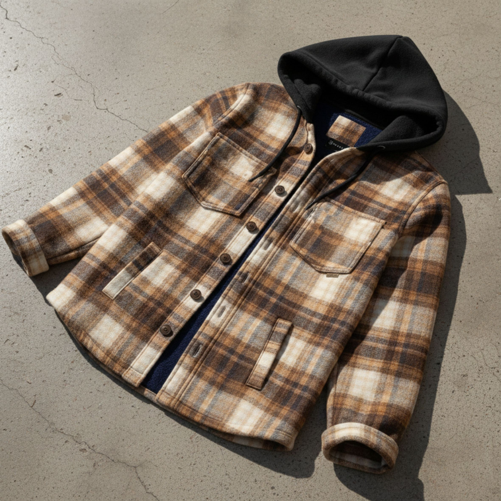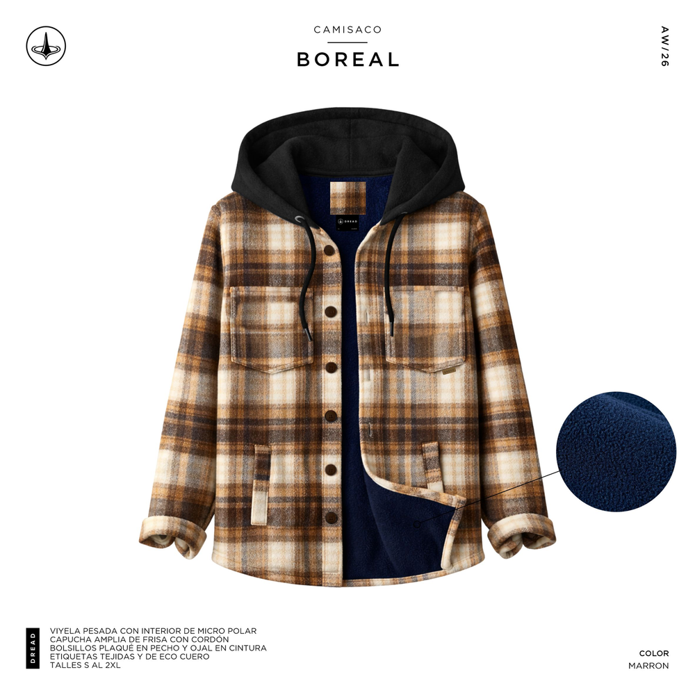 Camisaco de paño cuadrillé, interior forrado en micropolar, capucha de frisa con cordón, cuatro bolsillos, botones de pasta personalizados y apliques de eco-cuero.